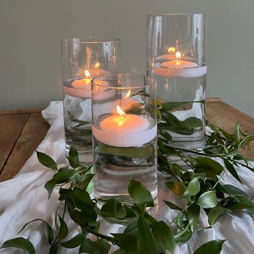Three cylinder vases of different heights. Available with floating candles, candle sand, LED pillar candles or regular pillar candles. Please do ask for candle prices.